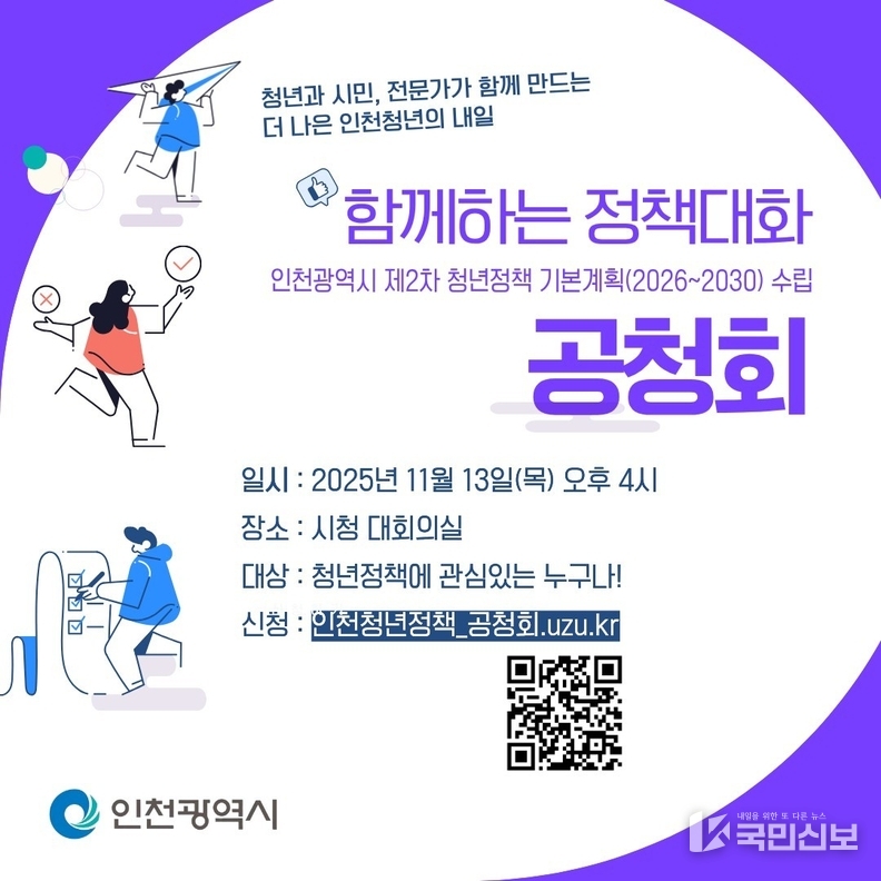 인천광역시는 오는 11월 13일 오후 4시, 시청 대회의실에서 '제2차 청년정책 기본계획(2026~2030) 수립'을 위한 공청회를 개최한다고 밝혔다.