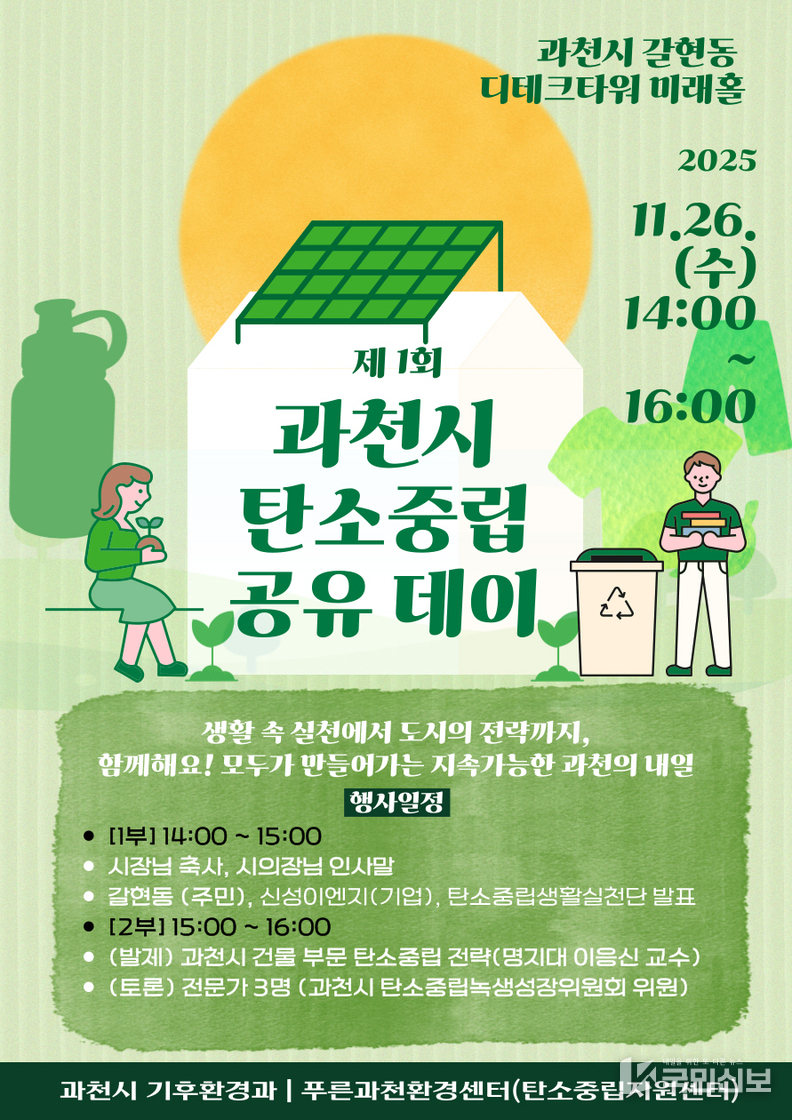 과천시는 오는 26일 갈현동 디테크타워 미래홀에서 ‘2025년 과천시 탄소중립 공유데이’를 개최한다고 20일 밝혔다.