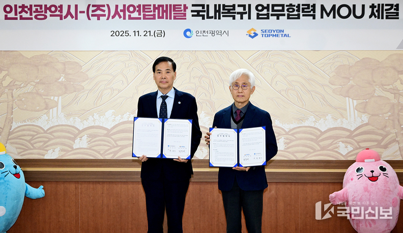 인천광역시는 11월 21일 원도심 1호 국내복귀기업인 ㈜서연탑메탈과 국내복귀기업 투자촉진 및 안정적 정착 지원을 위한 업무협약을 체결했다고 밝혔다.