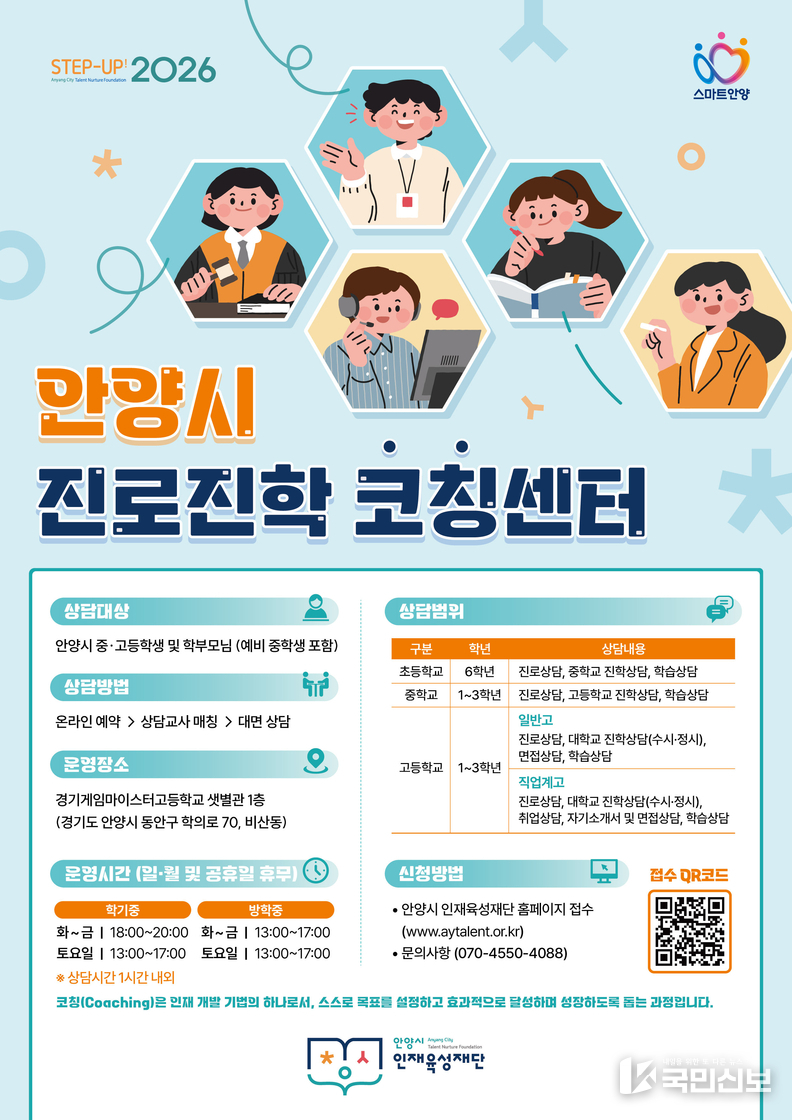 안양시 인재육성재단 소속 미래인재교육센터는 진로진학상담실 ‘꿈나래’의 새 명칭을 ‘안양시 진로진학코칭센터’로 확정했다고 8일 밝혔다.