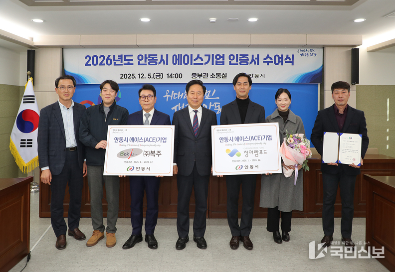 안동시는 ㈜복주, 농업회사법인 ㈜청어람푸드 2개 기업을 ‘2026년 안동시 에이스(ACE)기업’으로 선정하고 12월 5일 안동시청 소통실에서 인증서와 현판을 수여했다.