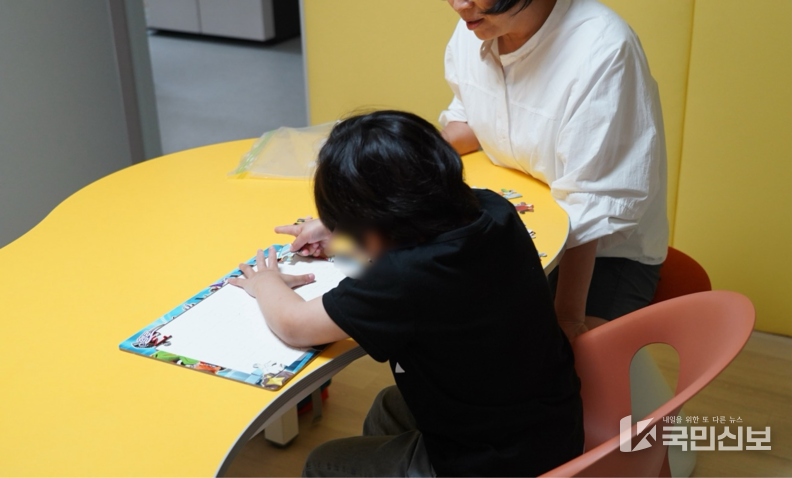인천시피해장애아동쉼터 이용 아동이 생활지도원과 퍼즐 맞추기를 하고 있다.