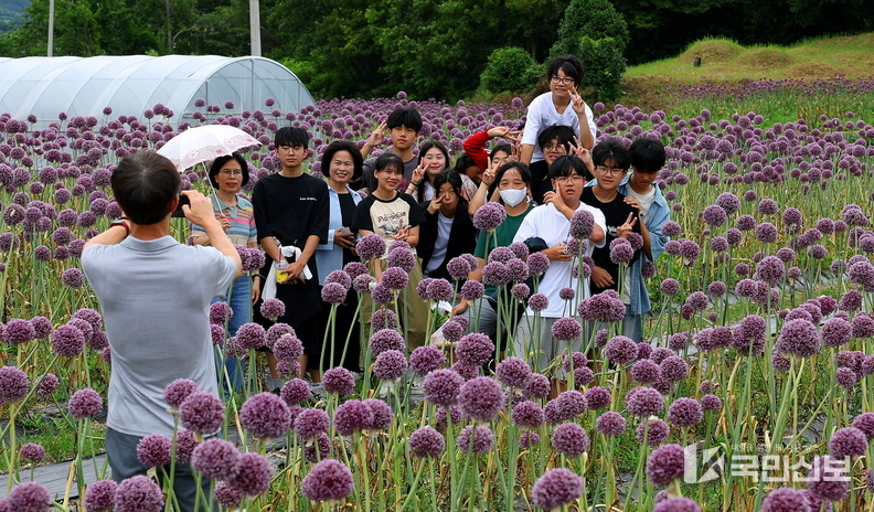 지난 20일 작천 코끼리마늘꽃 3Days 행사가 진행되고 있는 가운데 행사장을 찾은 관광객들이 보랏빛 물결이 출렁이는 코끼리 마늘꽃과 버들마편초를 배경으로 인생샷을 남기며 즐거운 한 때를 보내고 있다.
