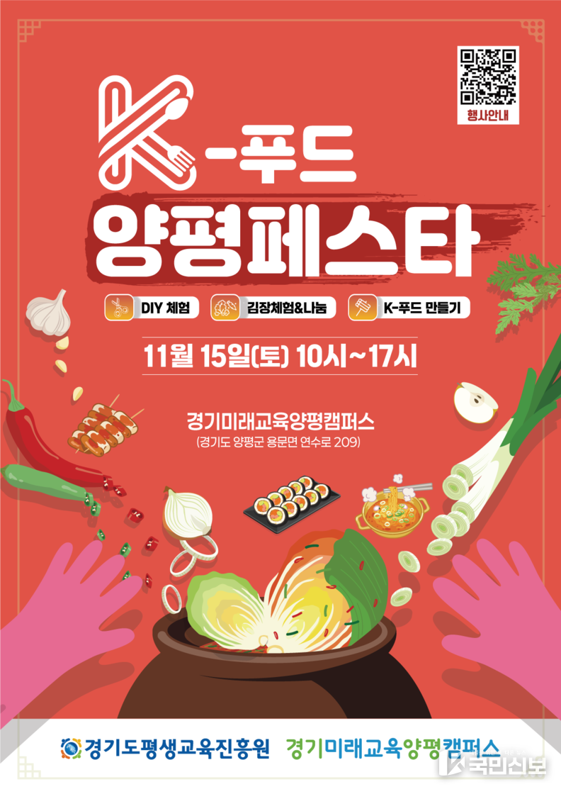 오후석 경기도평생교육진흥원장은 “K-푸드를 통해 배우고 나누는 평생학습의 의미를 담은 체험형 축제로, 가족과 외국인 모두 함께 즐길 수 있도록 준비했다”며 “양평캠퍼스의 자연 속에서 한국의 맛과 문화를 경험하고, 배움이 즐거움으로 이어지는 시간이 되길 바란다”고 말했다.
