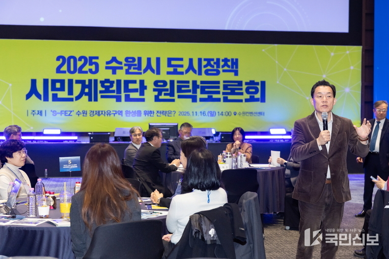 수원시는 16일 수원컨벤션센터 컨벤션홀에서 ‘S-FEZ 수원 경제자유구역 완성을 위한 전략은?’을 주제로 2025 수원시 도시정책 시민계획단 원탁토론회를 열고, 시민들의 의견을 들었다. 이날 토론회에는 이재준 수원시장과 도시정책시민계획단, 일반 시민, 청소년, 수원시의원 등 500여 명이 참석했다.