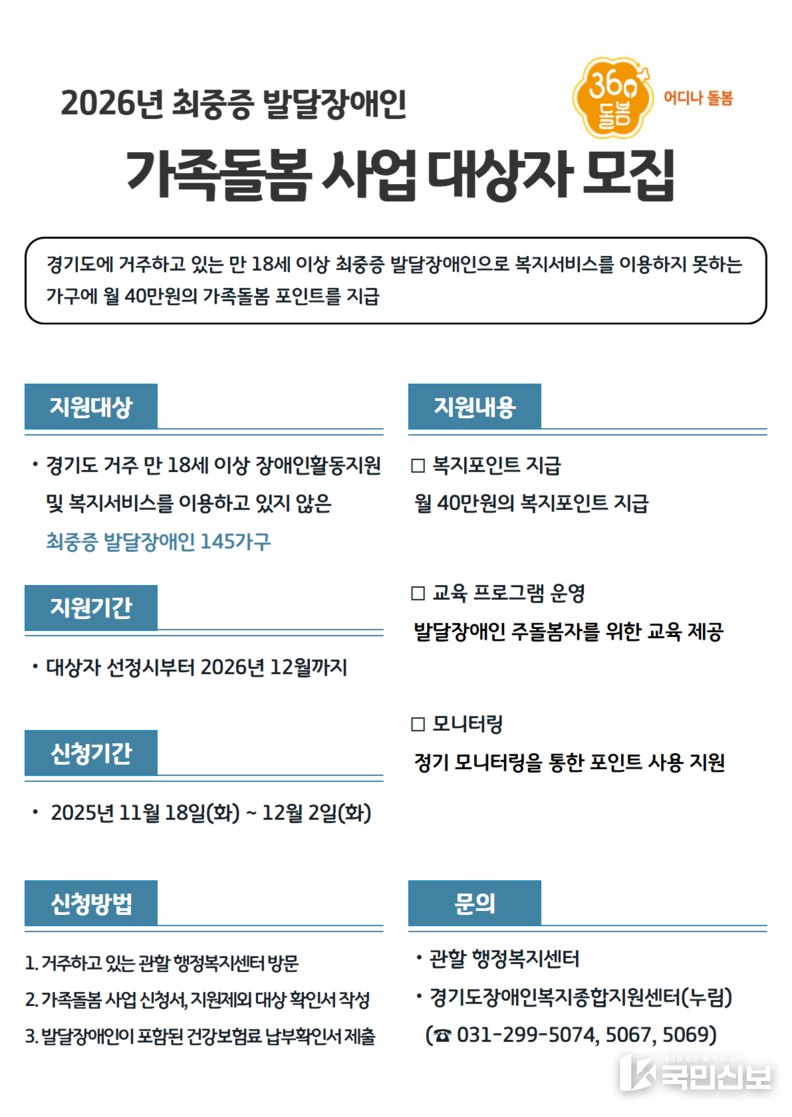 경기도가 2026년 최중증 발달장애인 가족돌봄 사업 대상자 145가구를 12월 2일까지 모집한다.
