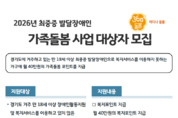 경기도가 2026년 최중증 발달장애인 가족돌봄 사업 대상자 145가구를 12월 2일까지 모집한다. 최중증 발달장애인이란 도전적 행동이 심하고 일상생활에 제약을 지닌 통합돌봄이 필요한 발달장애인이다. 경기도는 돌봄이 필요한 모든 도민들을 대상으로 누구나, 언제나, 어디나 빈틈없는 돌봄을 제공하는 360도 돌봄사업을 하고 있다. 최중증 발달장애인 가족돌봄 사업은 이 가운데 ‘어디나 돌봄’ 사업의 하나로 진행한다. 2024년 4월 처음 가족돌봄 사업을 시행한 이래 매달 210가구에 월 40만 원씩 돌봄포인트를 제공해 생필품 구입부터 여가활동 지원까지 다양한 부분에서 사용하여 장애인 당사자와 가족의 생활안정에 기여하고 있다. 2026년 최중증 발달장애인 가족돌봄 사업의 지원 대상은 경기도에서 거주하는 복지관, 직업재활서비스 등 복지서비스 미이용으로 돌봄사각지대에 놓인 만 18세 이상 발달장애인이다. 선정 시 월 40만 원 가족돌봄포인트를 1년간 지원하고 지속적인 모니터링으로 복지서비스와 대상자를 연계하는 서비스를 제공한다. 2026년 모집인원은 145명으로 전년과 다르게 모집인원을 시군별 배분해 31개 모든 시군에서 공정하게 선정자가 나오도록 반영했다. 신청은 11