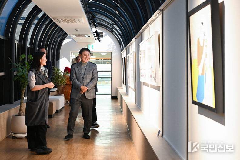 이날 김동근 시장은 본관 1층 로비에서 담은캘리그라피의 ‘영화 속 명대사(한글의 아름다움)’ 전시를 감상한 뒤, 연결통로로 이동해 ‘같이 걷는 발걸음’의 최소라 작가를 격려하고, 전시 공간 운영 방향에 대한 의견을 청취했다.