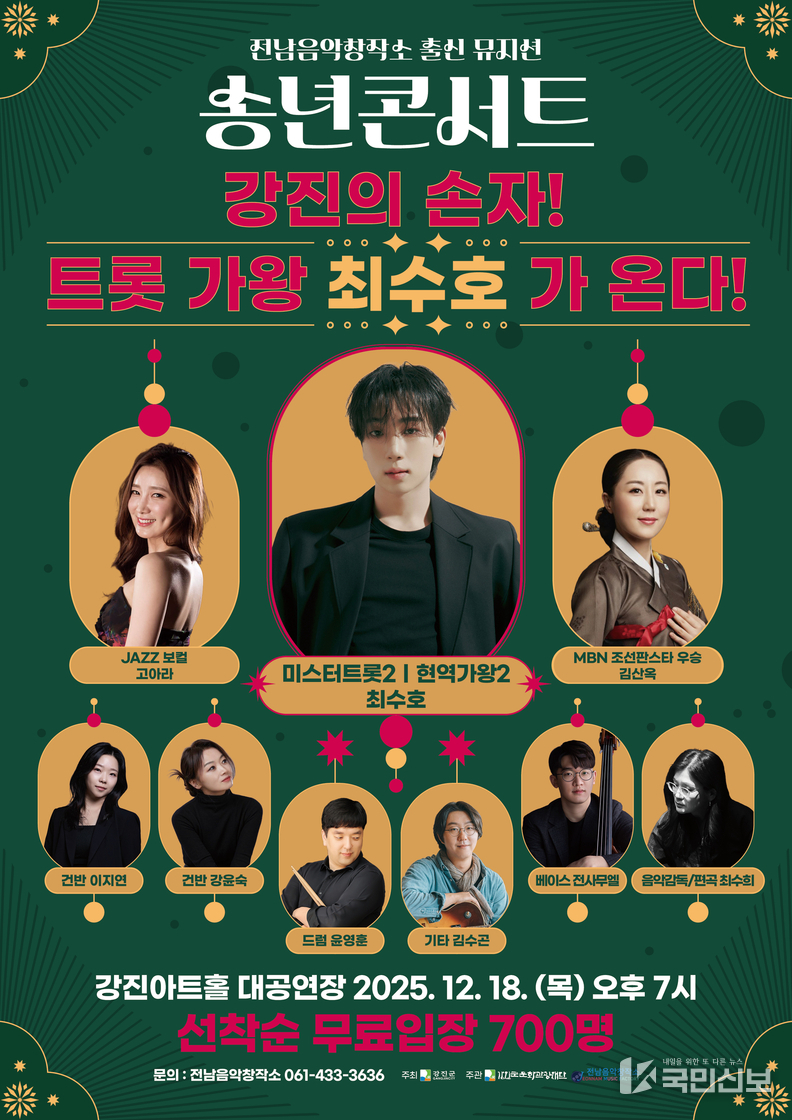 (재)강진군문화관광재단 전남음악창작소가 오는 18일 강진아트홀 대공연장에서 2025년 한 해의 성과를 군민과 나누는 특별 기획공연 「2025 전남음악창작소 뮤지션 송년콘서트」를 개최한다.