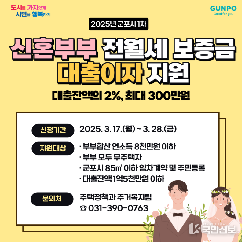 국민신보 기자 | 군포시가 신혼부부의 주거비 부담 경감과 안정적인 거주환경 조성을 위해 2025년 1차 군포시 신혼부부 무주택자 전월세 보증금 대출이자 지원사업 대상자를 선정하고, 가구당 연 최대 300만원을 지원한다고 밝혔다.