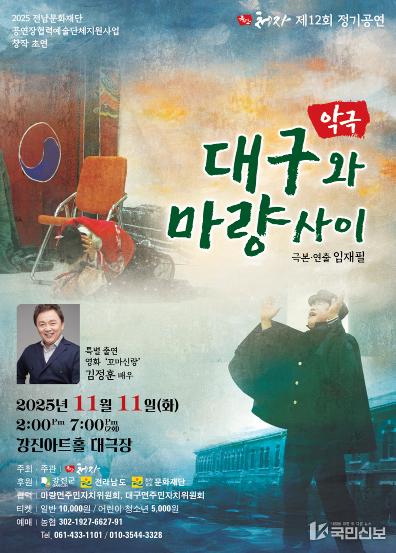 국민신보 추윤호 기자 | 악극 '대구와 마량사이'는 2025년 전남문화재단 공연장 협력예술단체 지원사업에 선정된 초연 작품으로, '극단청자'의 임재필 대표가 작품과 연출을 맡았다. 이번 공연은 오는 11일 오후 2시와 7시, 총 2회에 걸쳐 강진아트홀 대공연장에서 개최되며, '극단청자'의 제12회 정기 공연이기도 하다.