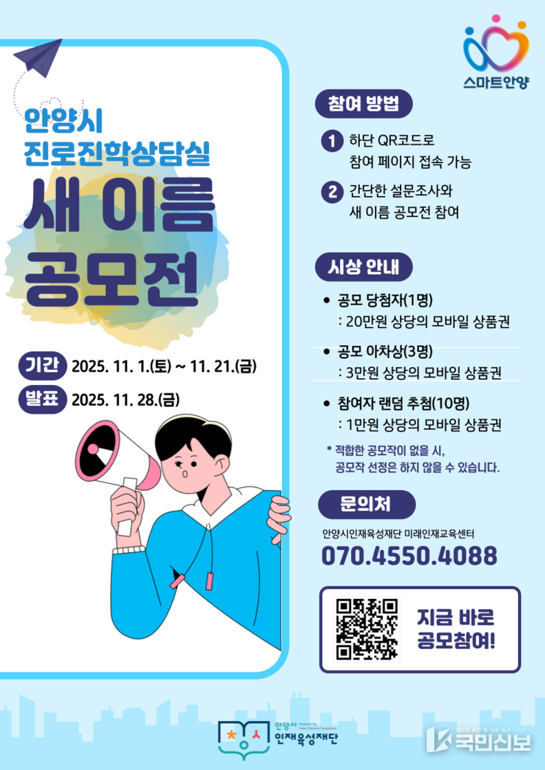 국민신보 박래철 기자 | 안양시 인재육성재단 미래인재교육센터가 운영하는 ‘안양시 진로진학상담실’이 시민과 함께 새 이름을 찾는다. 센터는 오는 21일까지 ‘새 이름 공모전’을 진행해 진로진학상담실의 새로운 도약을 알릴 계획이다.