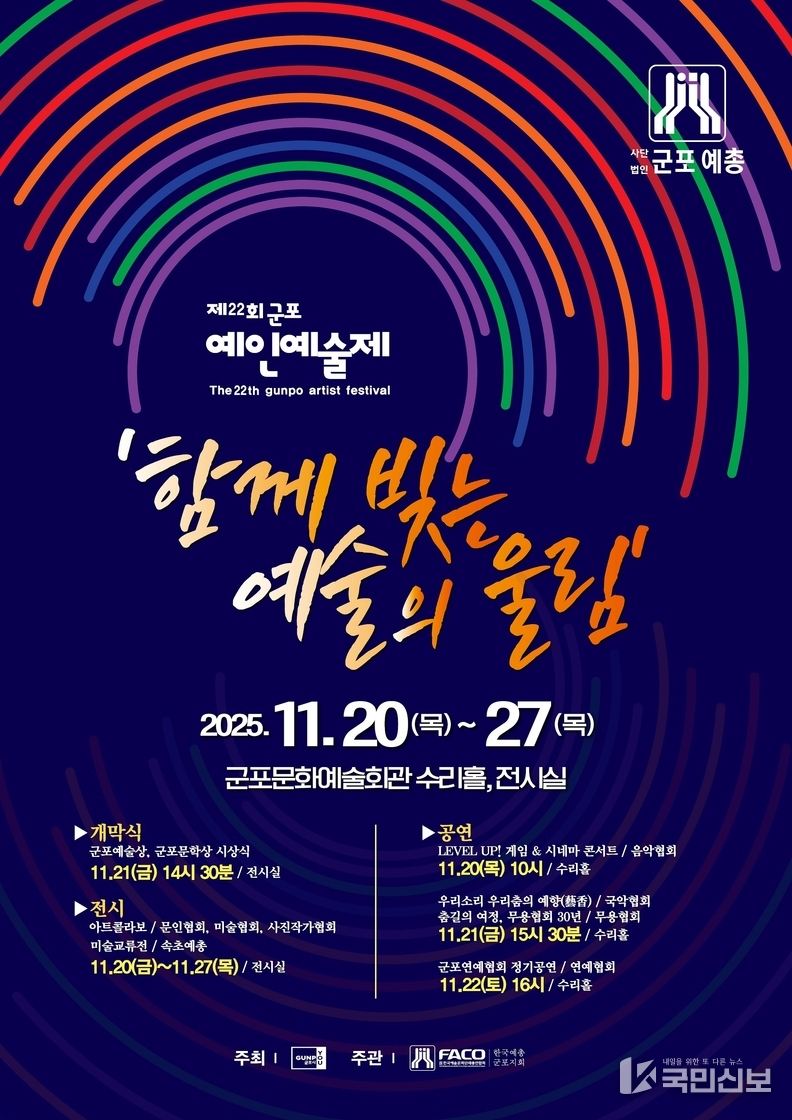 2025년 제22회 군포 예인예술제가 11월 20일부터 27일까지 군포문화예술회관 전시실과 수리홀에서 8일간 진행된다.