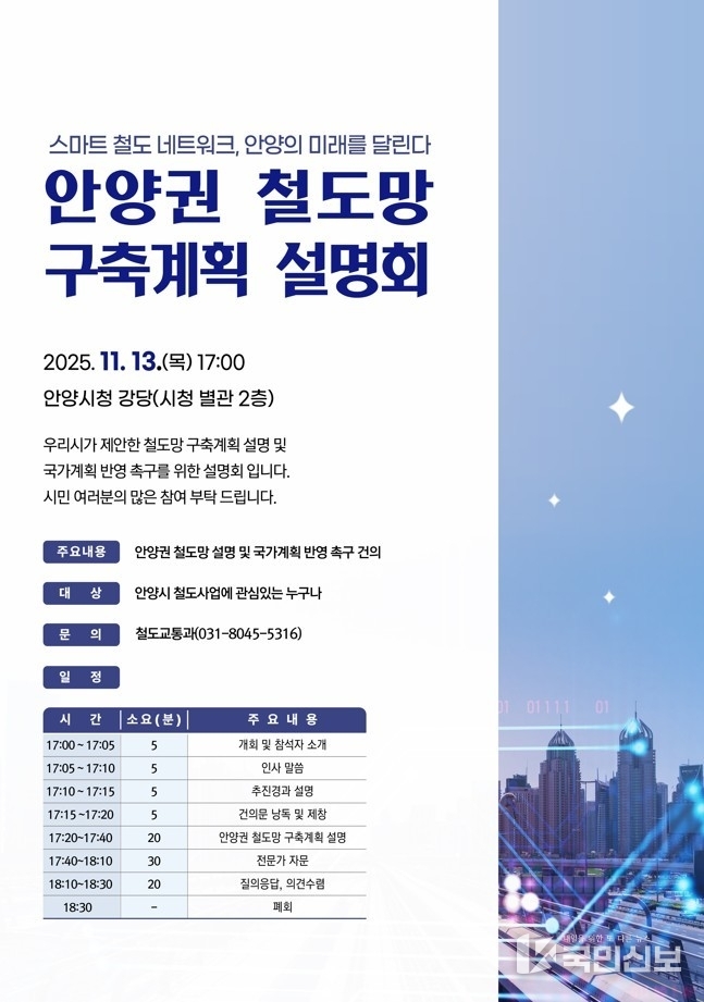 안양시가 오는 13일 오후 5시 시청 강당에서 ‘안양권 철도망 구축계획 설명회’를 개최하고 미래교통 중심도시·교통혁신도시 도약에 본격적으로 나선다고 6일 밝혔다.