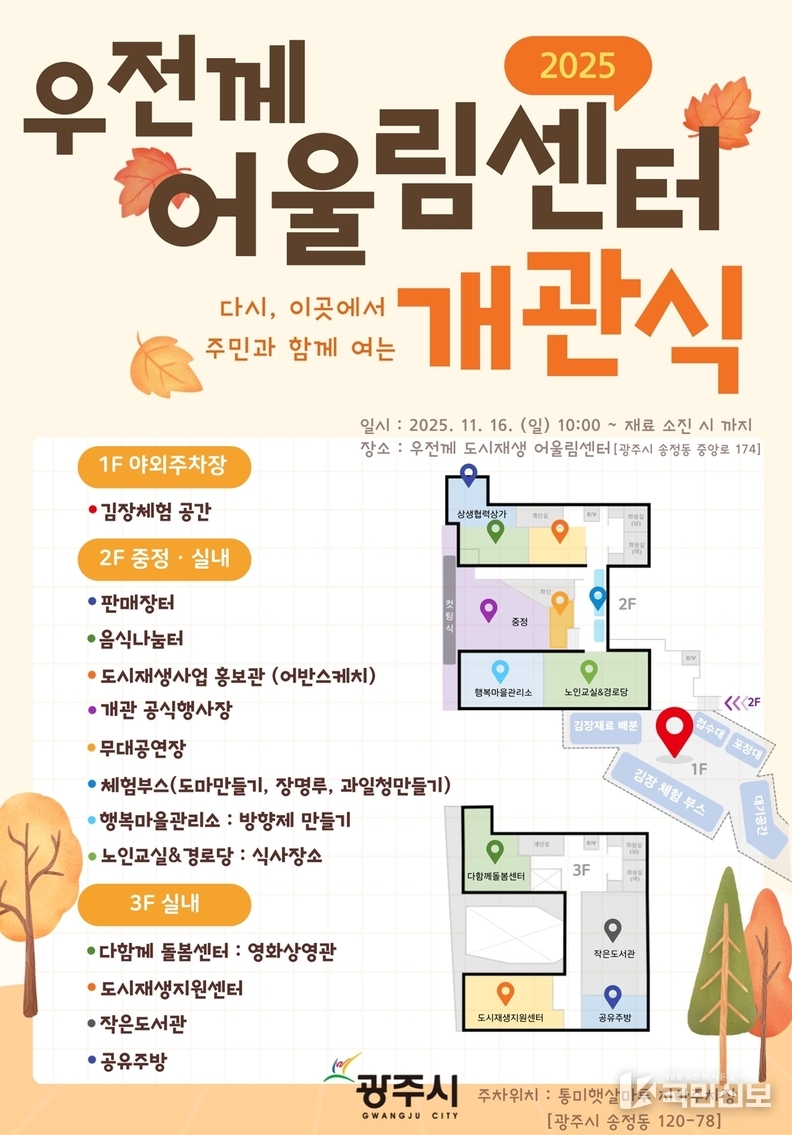 행사는 테이프 커팅식, 시장 기념사, 시설 관람 등의 공식 일정과 더불어, 송정동 지역공동체가 공동 주관하는 ‘우전께 다(多)가치 축제’가 함께 열려 지역 주민과 방문객이 함께 즐기는 축제의 장이 될 전망이다.