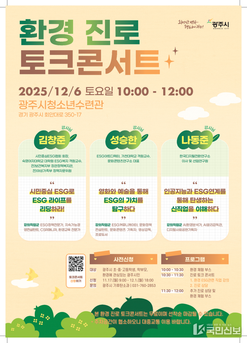 광주시는 오는 12월 6일 청소년수련관에서 환경 분야 전문 직업인을 초청해 특강과 진로상담을 진행하는 ‘환경 진로 토크콘서트’를 개최한다고 14일 밝혔다.
