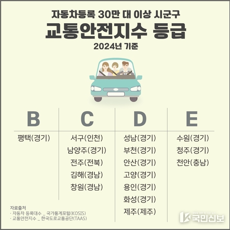 평택시 교통안전지수 등급은 30만 대 이상 자동차가 등록된 전국 시군구 중 가장 높은 것으로 나타났다. 자동차등록 30만 대 이상 시군구는 총 16개로, 평택시를 제외한 15개 시군구는 C~E등급에 머물렀다.