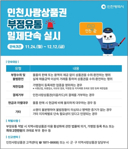인천광역시는 오는 24일부터 12월 12일까지 인천사랑상품권의 부정 유통을 방지하고 건전한 유통 질서를 확립하기 위해 일제 단속을 실시한다고 밝혔다.