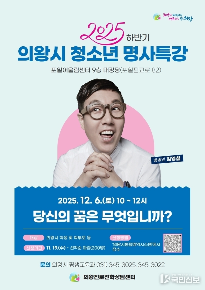 의왕시 진로진학상담센터는 관내 학생 및 학부모 등 200여명을 대상으로 오는 12월 6일 의왕시 포일어울림센터 9층 대강당에서 ‘2025 하반기 의왕시 청소년 명사 특강’을 개최한다고 밝혔다.