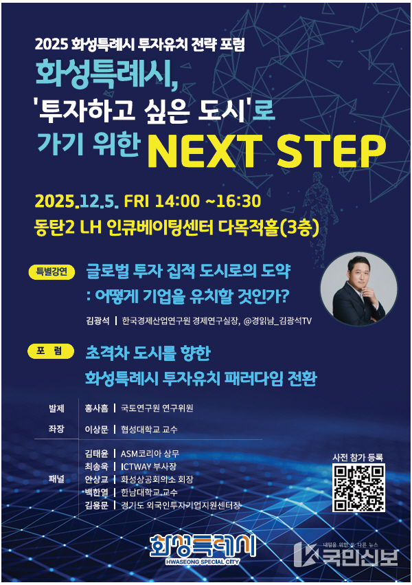 이번 포럼은 화성특례시에서 처음으로 개최되는 투자유치 전략 포럼으로 ‘화성특례시, 투자하고 싶은 도시로 가기 위한 넥스트 스텝(NEXT STEP)’을 부제로 개최된다.