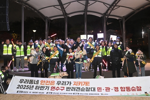 연수구는 지난 18일 반려견 순찰대(일명 연수지킴댕댕이), 연수2동·동춘3동 자율방범대, 인천경찰청 기동순찰대 등 50여 명이 참여한 '민·관·경 야간 합동 순찰'을 진행했다.