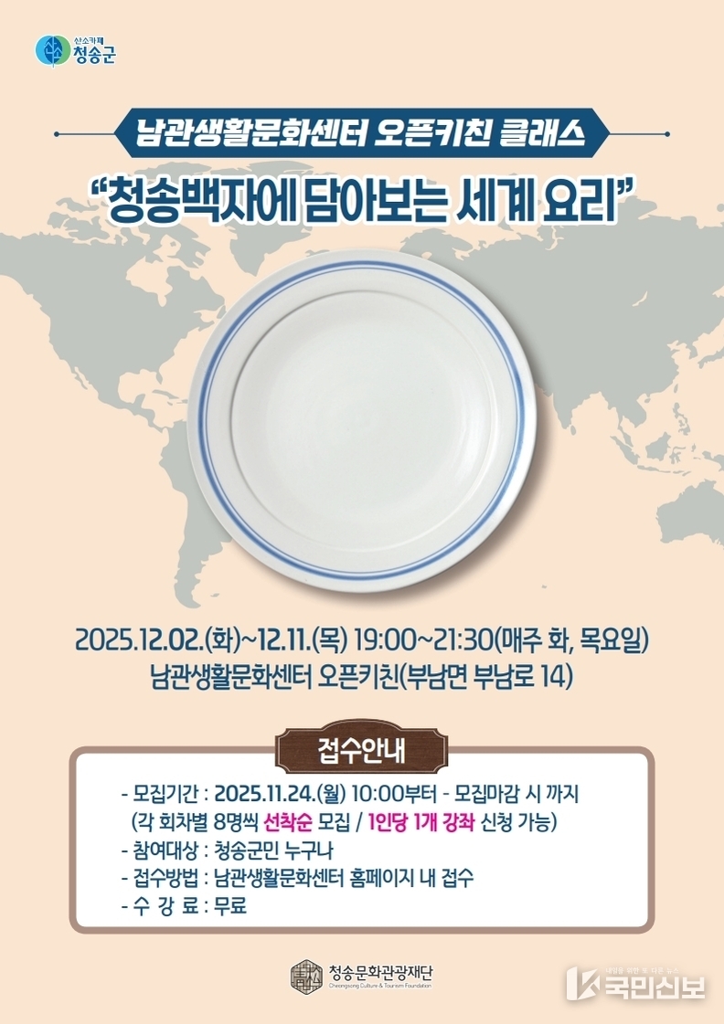 (재)청송문화관광재단은 지역 대표 문화유산인 청송백자에 세계 각국의 음식을 직접 만들어 담아보는 체험형 요리 수업 ‘청송백자에 담아보는 세계 요리’를 오는 12월 2일부터 11일까지 매주 화·목 저녁 7시부터 9시 30분까지 남관생활문화센터 오픈키친에서 총 4회 운영한다고 밝혔다.