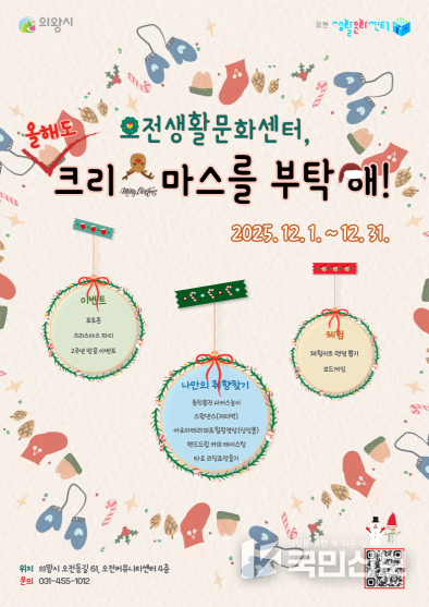의왕시가 오전생활문화센터 개관 2주년과 크리스마스 시즌을 맞아 시민들과 함께 즐길 수 있는 특별 프로그램 ‘오전생활문화센터, 올해도 크리스마스를 부탁해’를 12월 1일부터 31일까지 한 달간 운영한다.