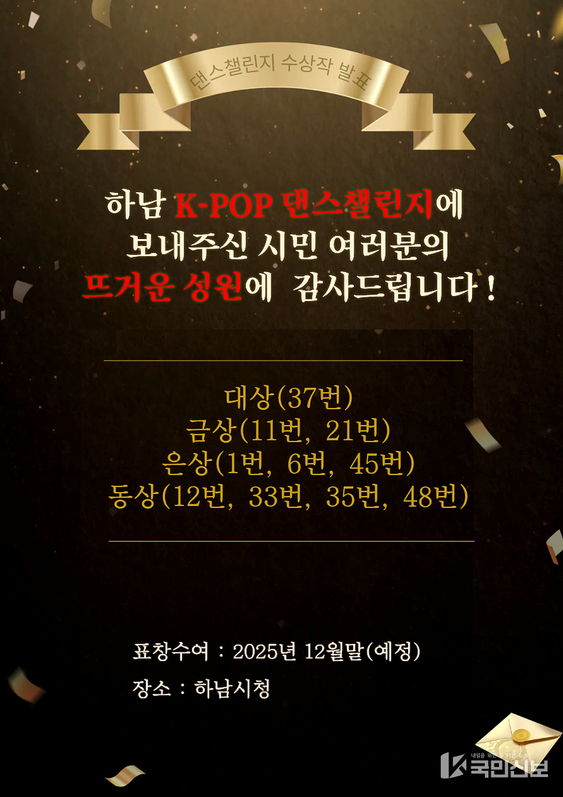 한편, 시는 오는 12월 종무식에서 대상·금상·은상·동상 등 수상자에게 시장 표창을 수여할 예정이며, 입상팀들의 댄스 영상은 하남시 공식 유튜브 채널을 통해 계속 만나볼 수 있다.