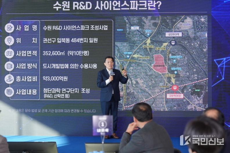 수원 R&D사이언스 파크 조성 사업은 권선구 입북동 484번지 일원 35만 2600㎡ 부지에 첨단과학연구단지를 조성하는 것이다. R&D(연구&개발), AI(인공지능), 반도체, IT(정보기술), 바이오 등 첨단연구기업을 유치해 세계를 선도하는 ‘글로벌 첨단 R&D 허브’로 도약하는 것을 목표로 한다.