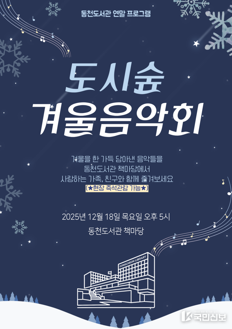 용인특례시 동천도서관은 18일 오후 5시부터 6시까지 동천도서관 지하 1층 책마당(열람형 계단공간)에서 ‘도시숲 겨울 음악회’를 연다고 밝혔다.